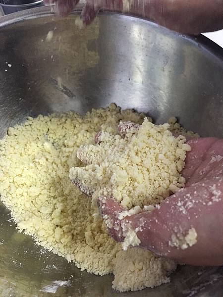 1.冰奶油切小塊,低粉和鹽用手搓成細沙狀